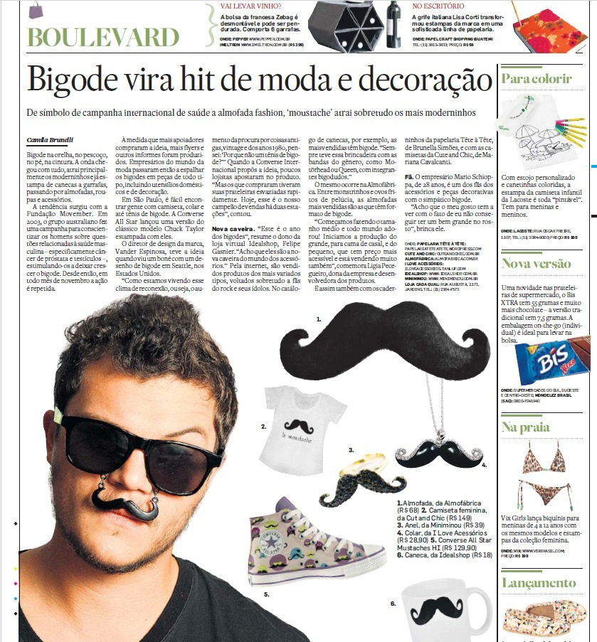 Texto aborda a ascensão do “moustache” como símbolo de moda e decoração, derivado de campanhas internacionais de saúde. O bigode virou estampa de produtos variados — de canecas e almofadas a camisetas e calçados — e se consolidou como item pop e divertido. A matéria aborda o caráter multifuncional da tendência, que une estilo, humor e identidade cultural.